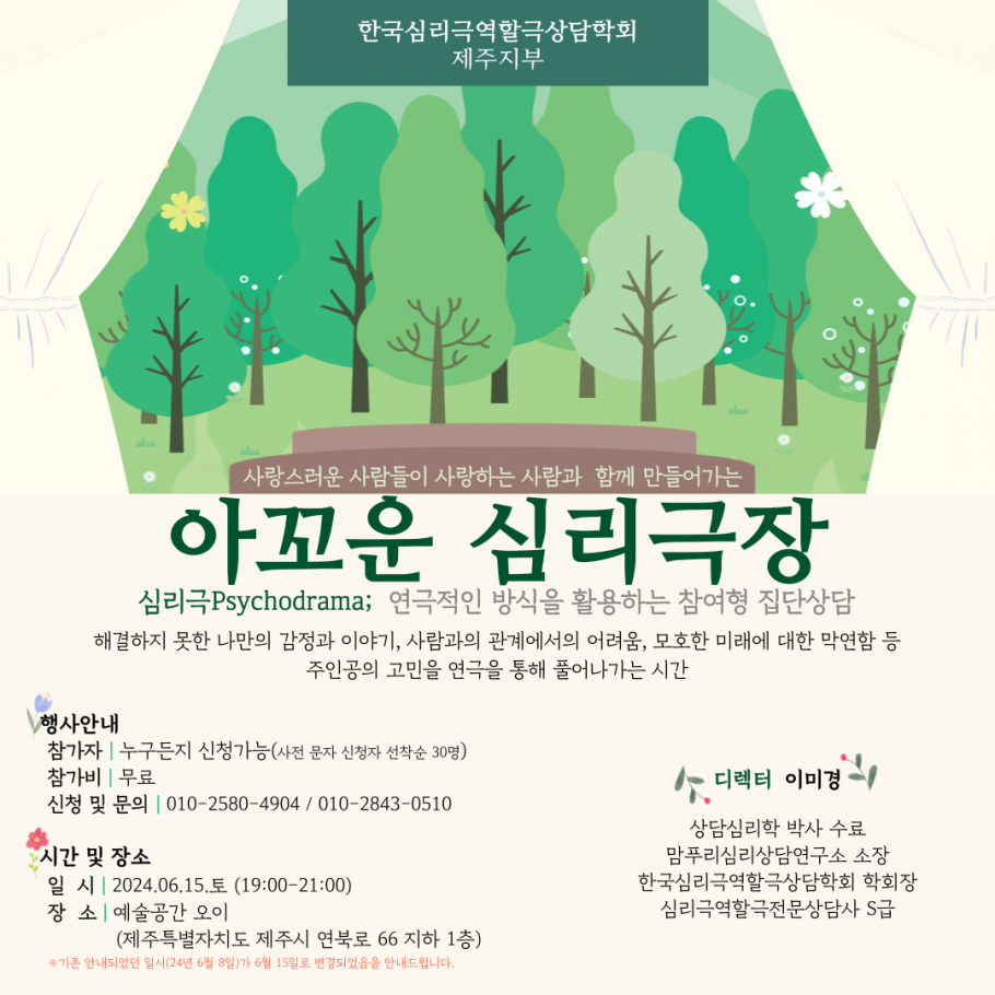 제주지부 "아꼬운심리극장" 6월 심리극 일정을 아래와 같이 안내드립니다.