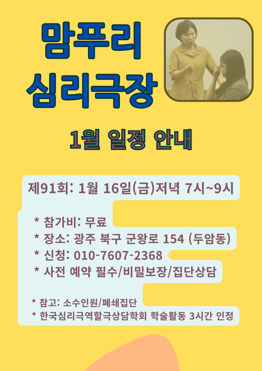- 이전글1회 Good+ (굿플러스)심리극장 운영후기입니다 26.01.15
