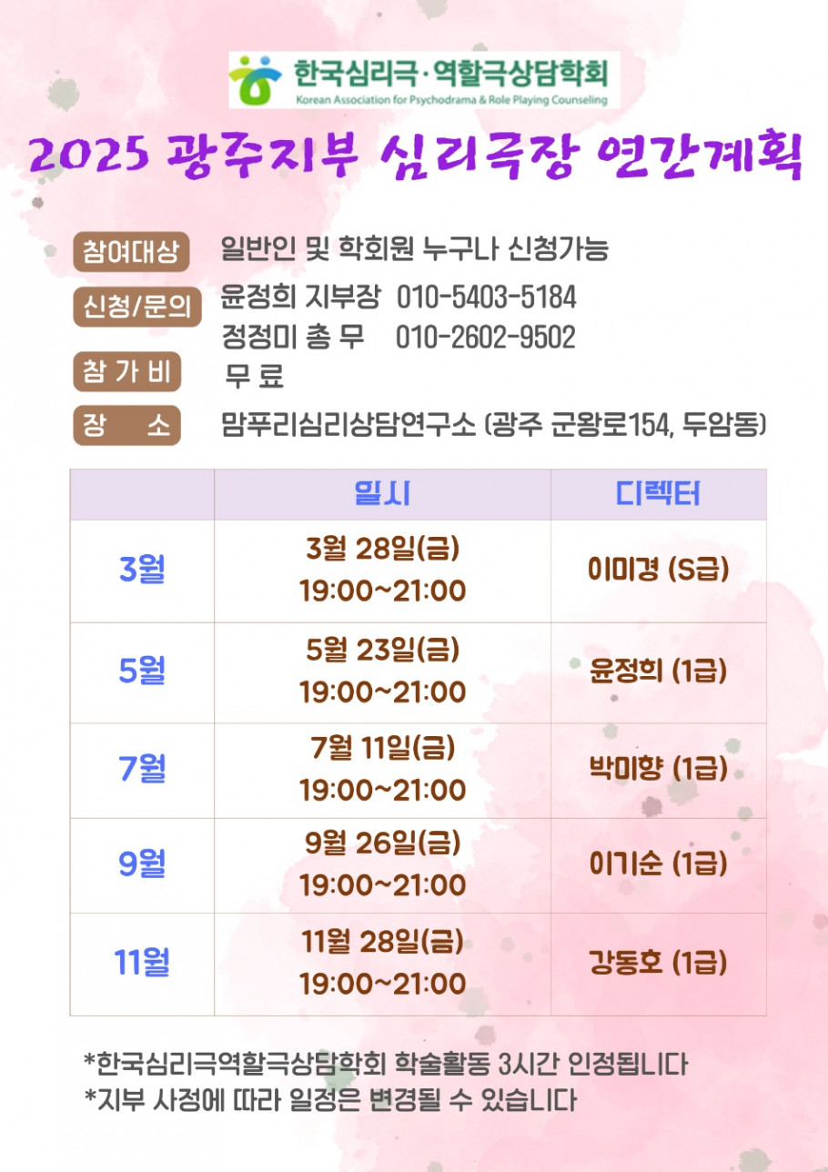광주지부 2025년 광주지부 심리극 연간계획표 페이지 정보 작성자 jjm9184 댓글 0건 조회 1,779회 작성일 25-02-13 13:13 목록 본문 2025년 광주지부 심리극 연간계획표 이전글25년 2월 지부 참여자 명단(지부참여증빙) 올려드립니다. 25.02.19 다음글맘푸리심리극장 2월 안내 25.01.28 댓글 0 댓글목록 등록된 댓글이 없습니다.