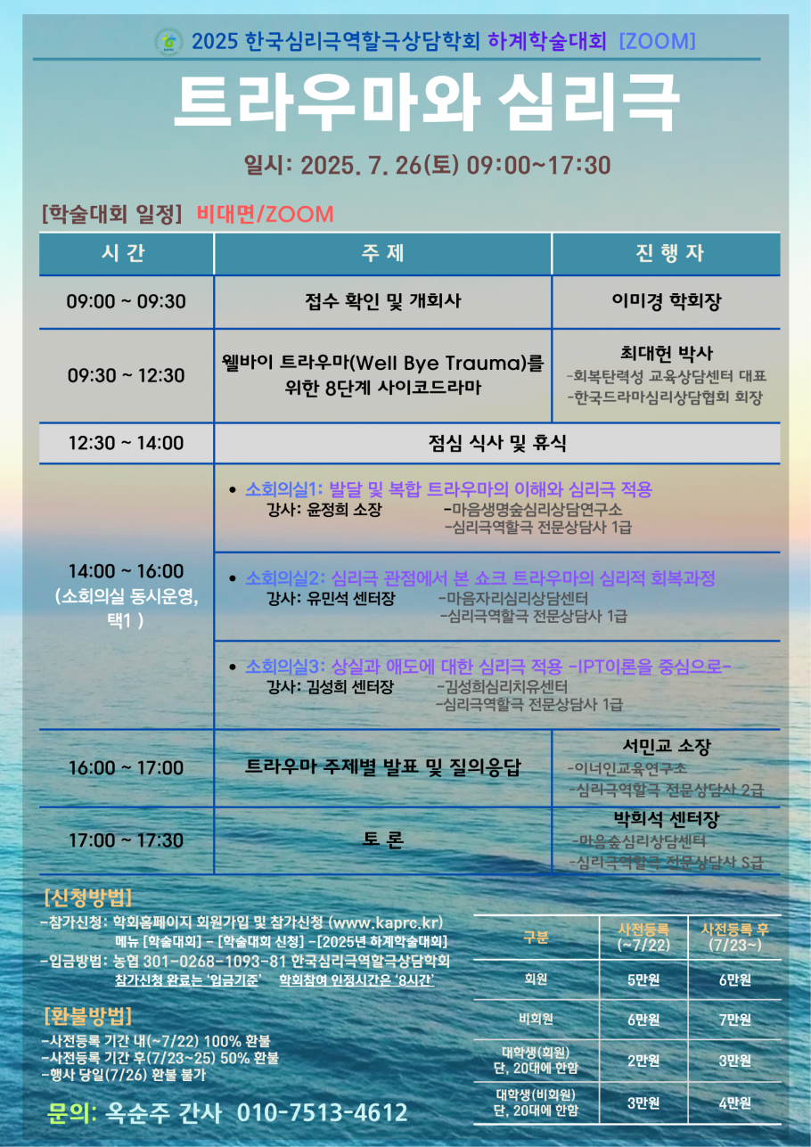 2025년 하계학술대회가 7.26.(토) 09:00~17:30 '트라우마와 심리극' 주제로 열릴 예정입니다.