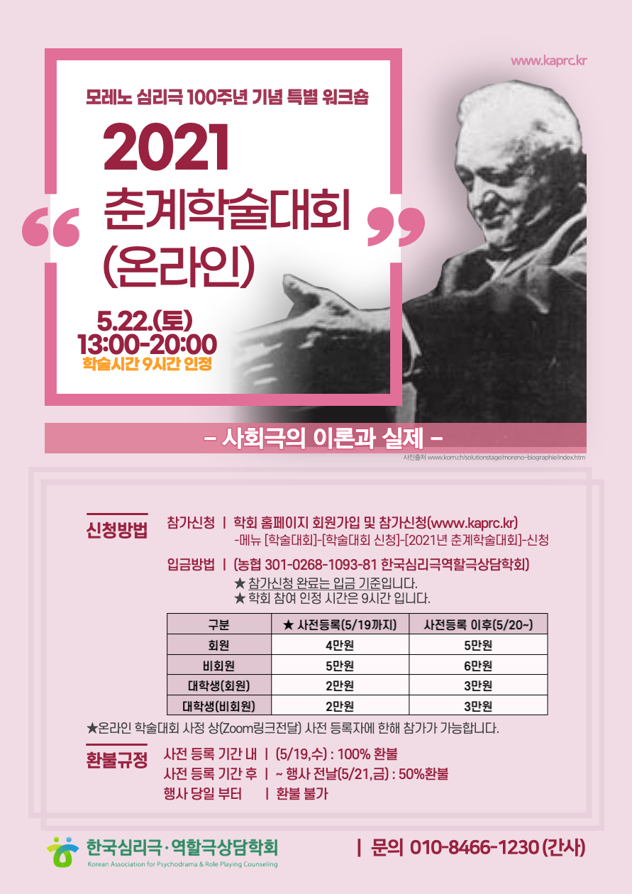심리극 100주년 기념 특별워크숍으로 "사회극의 이론과 실제"라는 주제로 춘계학술대회를 열고자 합니다.